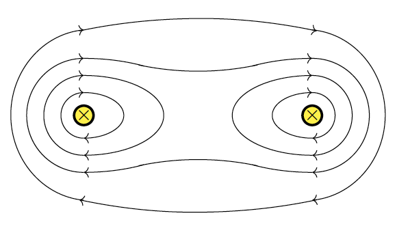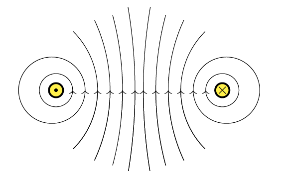 If the currents in the two wires flow in the same direction, the magnetic fields between the wires reinforce each other, producing a stronger field outside the pair and a weaker field between them. This imbalance pulls the wires towards each other, so they attract. On the other hand, if the currents run in opposite directions, the magnetic fields between the wires reinforce instead, while the fields outside are weakened. The result is a pushing apart of the two wires, so they repel each other.