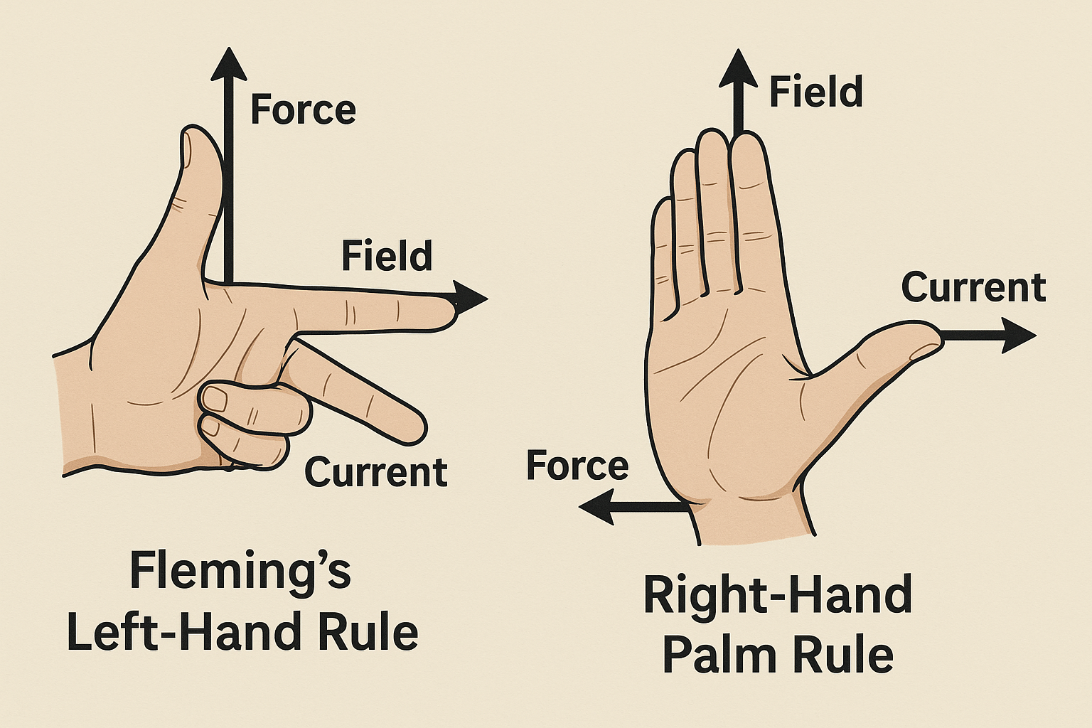 Fleming’s Left-Hand Rule and the Right-Hand Palm Rule are visual tools used to predict directions in electromagnetic interactions.