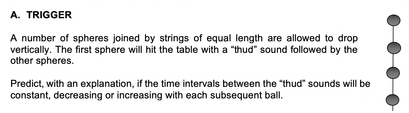 In a recent class on Kinematics, I prepared a string of 4 pendulum balls, each separated about 20 cm apart and dropped them from a height. Before that, I got students to predict whether the intervals in time between drops will be constant, increasing or decreasing.