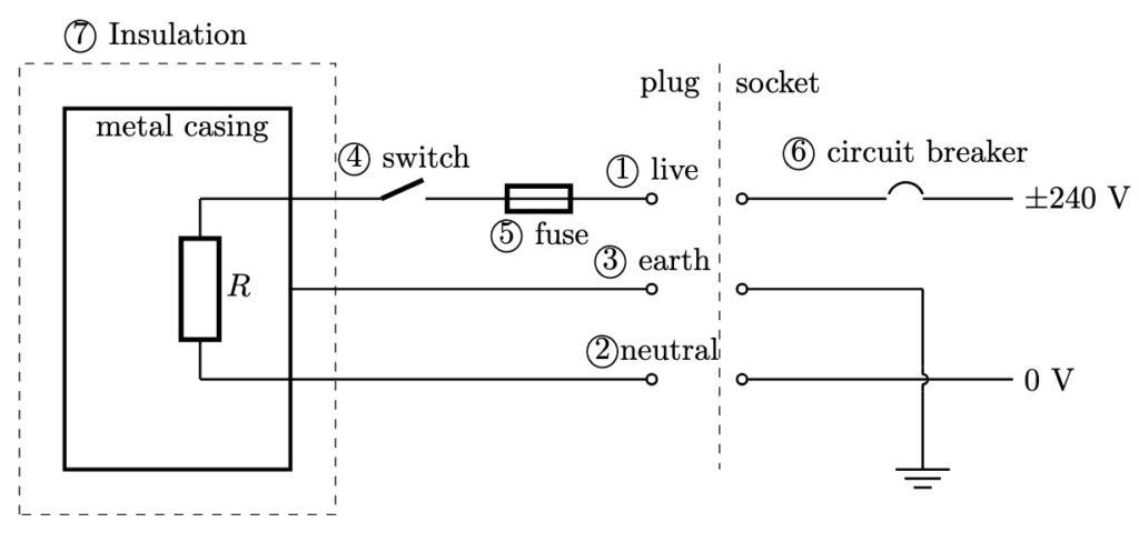 - Live wire: wire carrying the current at a high voltage from the power source to the electrical appliance.