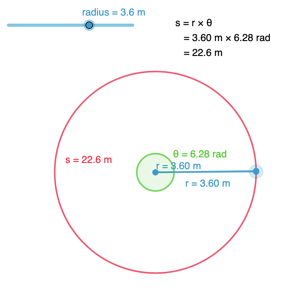 This GeoGebra app shows the relationship s = rθ . One activity I get students can do is to look at the value of θ when the arc length s is equal to the radius r . This would give...