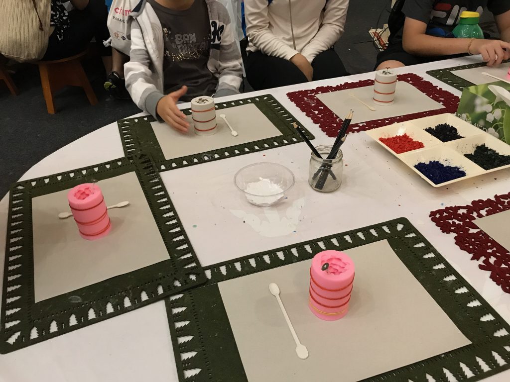 After exiting the first workshop, visitors are brought to the candle making workshop. We were each given a rubber mould, some melted soy wax, colouring and a few drops of liquid scents to make our own Christmas tree candles.